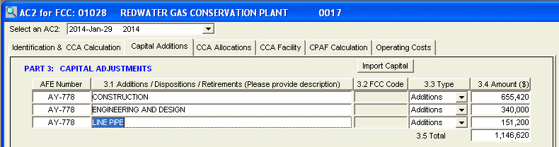 The AC2 Capital Additions tab is used to edit and enter capital additions, disposals, and retirements for a facility cost center.