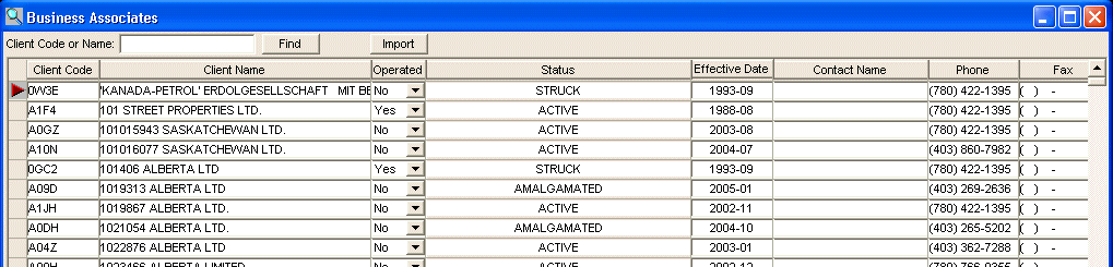 The business associates will be sorted by Client Name, but you can sort by any column by clicking on the heading of that column. For example, to sort by client code, click the Client Code heading button. Clicking it more than once will sort the data in ascending or descending order.