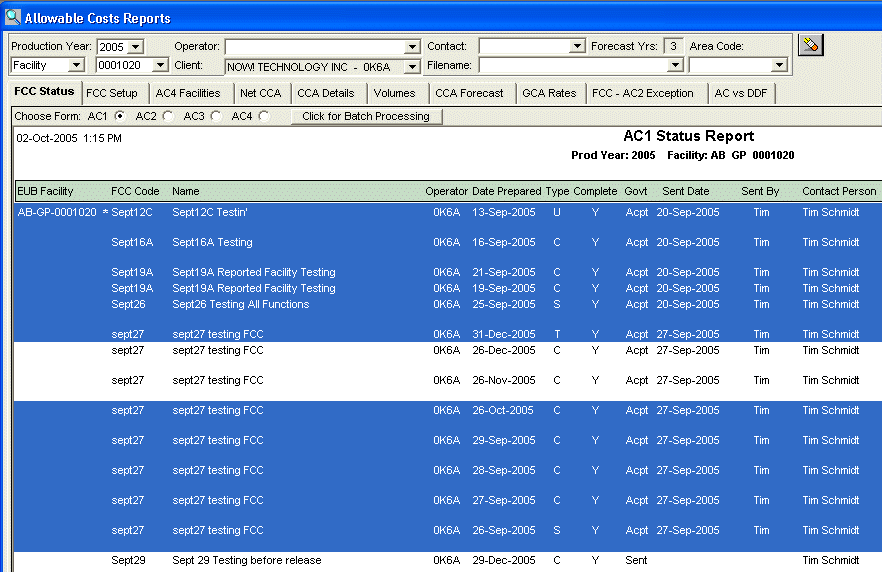 - highlite which FCCs you want to be included in the file you are creating. ONLY FCCs with the Complete flag sent to Y will be included; others will be ignored. Setting the Complete flag to Y is done on the AC1-AC5 form or you can do many at one time using the Form Tracking window.