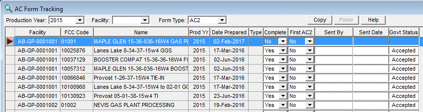 Note: In the Form Type list box, you will see entries titled AC2 File and AC4 File. If you choose one the these form types and click Retrieve, you do not get a list of FCCs, but a list of the AC2 or AC4 filenames that were used to send electronic forms to the govt. When you enter a Sent By, Sent Date, or Govt Status for these rows and Save them, every AC2 or AC4 form that was in the file is updated with this information.