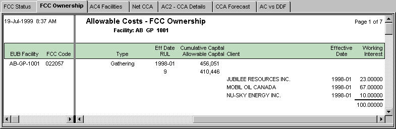 The Allowable Costs FCC Ownership Report is used to see the current ownership of a FCC and other master file information showing name, type, remaining useful life, and cumulative and allowable capital cost amounts.