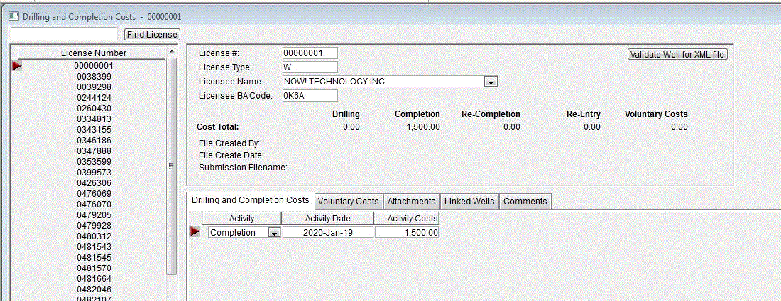 Once wells are added, Drilling and Completion Costs, Voluntary Costs, Attachments, Linked Wells, and Comments can be added to this well. The 'Validate Well for XML File' button will confirm if the well's detail will create a successful XML file for submission to Petrinex.