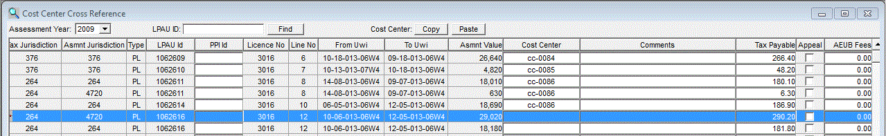 EDI Viewer has a list of all LPAU ID that have been imported from Well and Pipeline files. Here you can enter a PPI ID description, associate the property with a Cost Center, enter a Cost Center description, AEUB fees, appeal ( Y or N ) and comments. The reports with Cost Centers will use these references to link cost centers to properties. Press the Save button on the toolbar to save your work.