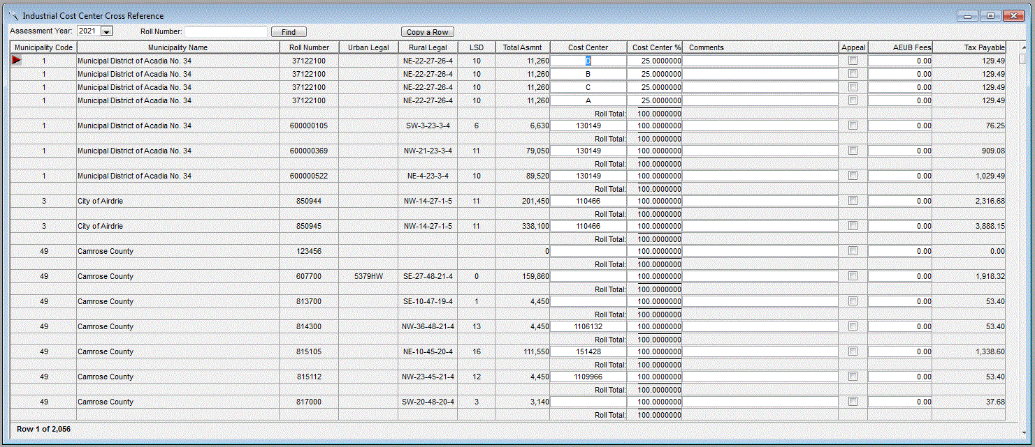 EDI Viewer has a list of all Roll Numbers that have been imported from Industrial files or input in the Manual Industrial Facilities window. Here you can enter a Cost Center, AEUB fees, flag the roll for appeal ( Y or N ) and add comments. The reports with Cost Centers will use these references to link cost centers to properties, and the GL Upload will use these cost centers when creating your GL Upload file. Press the Save button on the toolbar to save your work.